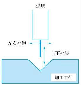 機器人自主焊接,為焊接機器人加上跟蹤功能,通過傳感設(shè)備實現(xiàn)對焊縫的數(shù)據(jù)進(jìn)行采集、分析,獲取焊縫的尺寸、坐標(biāo)、形狀等信息,按照事先設(shè)定的增益、偏差等參數(shù)值,對焊槍上下和左右方向進(jìn)行補償。