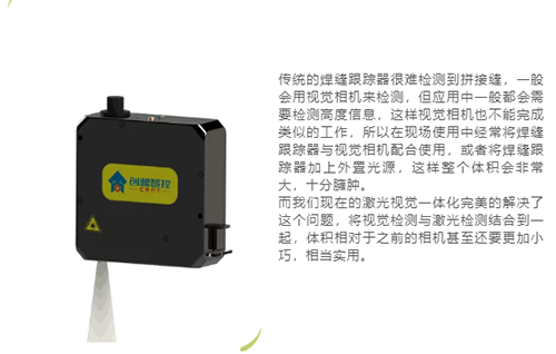 傳統的焊縫跟蹤器很難檢測到拼接縫,一般會用視覺相機來檢測,但應用中一般都會需要檢測高度信息,這樣視覺相機也不能完成類似的工作,所以在現場使用中經常將焊縫跟蹤器與視覺相機配合使用,或者將焊縫跟蹤器加上外置光源,這樣整個體積會非常大,十分臃腫。