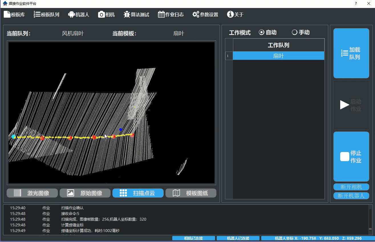 本系統主要用于(軸流-離心)風扇扇葉焊接所出的解決方案,相比之前使用尋位跟蹤功能去焊接,焊接周期降低,不用考慮弧光的影響,示教調試時間減少,采用新的算法掃描,記錄實時焊接狀態數據,提供日志功能,可通過偏移實現兩面焊接。